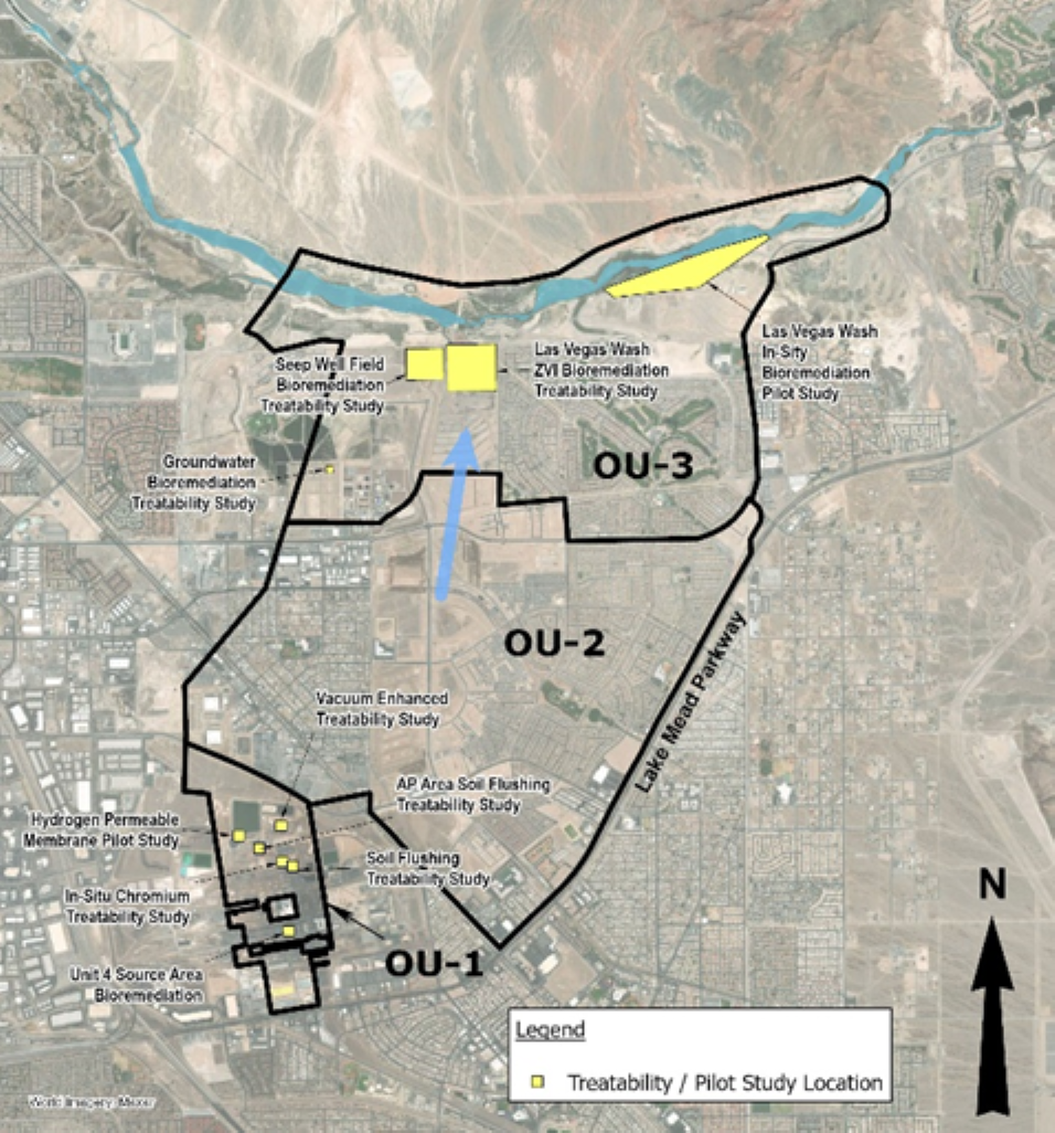 Work Plans: Pre-field and laboratory activities were described in the Las Vegas Wash Bioremediation Pilot Study Work Plan dated September 22, 2017 (NDEP approved on October 16, 2017). Results of the bench-scale studies and implementation of the pilot study are described within the Las Vegas Wash Bioremediation Pilot Study Work Plan Addendum dated November 11, 2019 (NDEP approved on December 11, 2019).